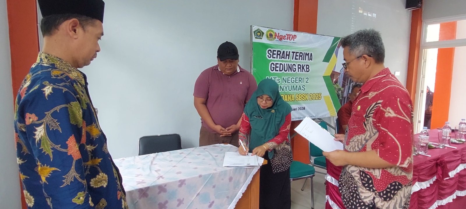 BANYUMAS (Humas) – Lingkungan pendidikan di MTsN 2 Banyumas kini semakin lengkap dengan diresmikannya gedung Ruang Kelas Baru (RKB). Acara serah terima dan peresmian gedung yang bersumber dari dana Surat Berharga Syariah Negara (SBSN) tahun anggaran 2025 ini berlangsung khidmat di lokasi gedung baru, MTsN 2 Banyumas pada pukul 09.00-12.30 Wib, Kamis (15/01/2026).Acara peresmian gedung RKB ini ditandai dengan pemotongan pita yang dilakukan oleh Kepala Kementerian agama Kabupaten Banyumas Dr. H. Ibnu Asaddudin, S.Ag., M.Pd, pejabat PPPK dari Kanwil Kemenag Jawa Tengah Khaerudin, S.Pd.I, dan Kepala MTsN 2 Banyumas Atik Restusari, S.Pd., M.Pd, dan disaksikan oleh seluruh pejabat dan tamu undangan. Turut hadir dan menyaksikan peresmian serta pemotongan pita gedung RKB MTsN 2 Banyumas, Kasubag.TU, Dr. H. Edi Sungkowo, S.Pd., M.Pd., Konsultan Perencana CV. Wulandari, Konsultan Pengawas CV. Hasta Karya Laksanakan, Penyedia Jasa PT. Karina Prima Utama dan segenap jajaran komite madrasah serta beberapa perwakilan guru dan karyawan MTsN 2 Banyumas.Gedung megah tersebut terdiri dari 6 ruang kelas yang dirancang modern untuk menunjang kenyamanan kegiatan belajar mengajar. Kepala Kankemenag Kabupaten Banyumas dalam sambutannya menyampaikan apresiasi atas selesainya pembangunan ini. Beliau berharap fasilitas ini dapat memicu semangat baru bagi para guru dan siswa.”Pembangunan gedung RKB melalui skema SBSN ini merupakan bukti nyata perhatian pemerintah terhadap kualitas pendidikan madrasah. Saya berharap fasilitas ini dijaga dengan baik dan benar-benar dimanfaatkan untuk mencetak generasi yang unggul secara intelektual maupun spiritual,” ujar Kankemenag Banyumas, Dr. H. Ibnu Asaddudin, S.Ag., M.Pd.Senada dengan hal tersebut, Kepala MTsN 2 Banyumas, Atik Restusari, mengungkapkan rasa syukur dan terima kasihnya kepada semua pihak yang terlibat, mulai dari proses pengajuan hingga gedung siap digunakan.”Alhamdulillah, kehadiran enam ruang kelas baru ini adalah jawaban atas kebutuhan kami akan ruang belajar yang representatif. Kami berkomitmen untuk memaksimalkan penggunaan gedung ini demi meningkatkan prestasi akademik maupun non-akademik serta nantinya bisa menambah daya tampung murid baru di MTsN 2 Banyumas,” ungkap Atik Restusari.Dengan adanya tambahan enam ruang kelas ini, MTsN 2 Banyumas diharapkan mampu menampung antusiasme masyarakat yang tinggi untuk menyekolahkan anak-anak mereka di madrasah tersebut, sekaligus mewujudkan lingkungan sekolah yang lebih kondusif dan berkualitas.(Ning/twm)